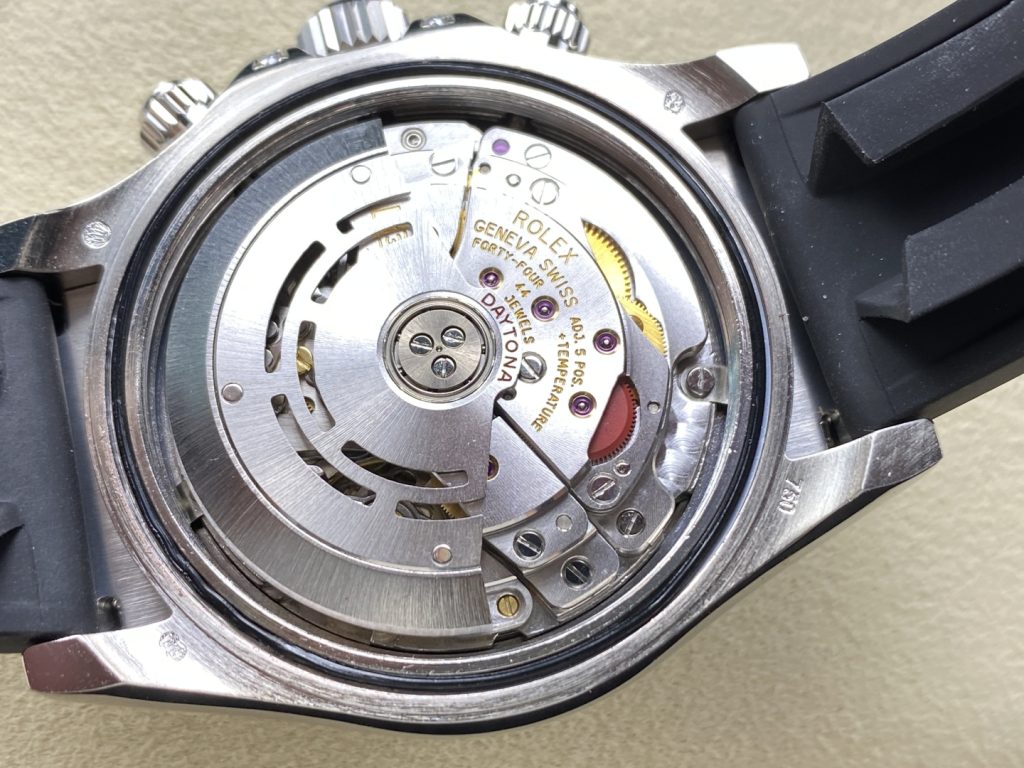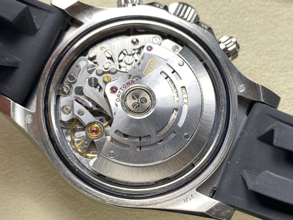 ケースはホワイトゴールド調で、側面ではダイヤモンドのバゲットカットがベゼルを囲み、プッシャーとラグのダイヤセットがアクセントになります。重量測定では146.5gを表示し、重厚感が本物級です。ムーブメントでは、4130ムーブメントの精巧な機構が覗け、耐久性と精度を証明します。黒いオイスターフレックスストラップは快適で、クラスプにロレックスのロゴが刻印され、安全性を確保できます。